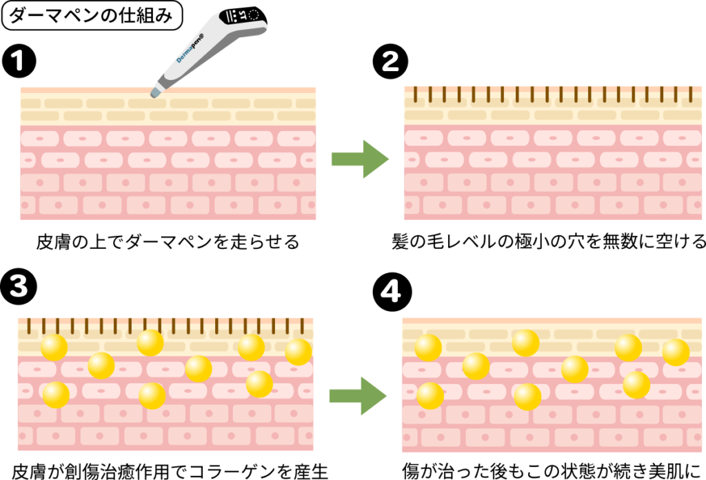 ダーマペン4とは極細の針を皮膚に刺し小さな傷をつけ、肌の自己再生力で 肌を生まれ変わらせるペンタイプの治療器具です。