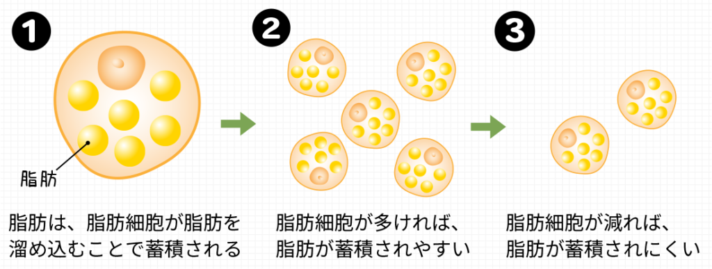 脂肪のボリュームは脂肪細胞の数がふえるのではなく、脂肪細胞1つ1つが大きくなることによって起こります。脂肪細胞は、思春期まではその数を増やしますが、それ以降は変化しないといわれています。